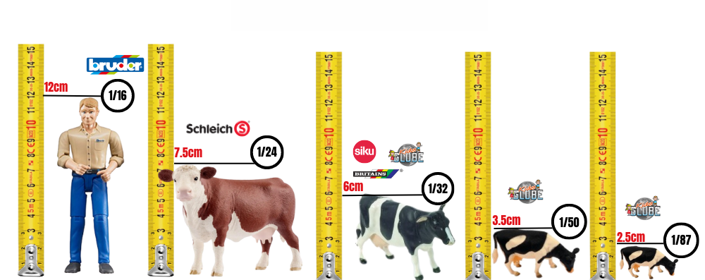 Attention à la compatibilité des échelles ! Par exemple, si vous achetez une remorque à bétail 1:16, vous devez prendre des vaches 1:16 sinon elles seront trop petites dans une grande remorque. À l'inverse, si vous prenez une ferme Kids Globe échelle 1:32, il vous faudra des vaches 1:32 car les vaches 1:16 sont trop grandes et ne pourront pas rentrer dans l'étable !