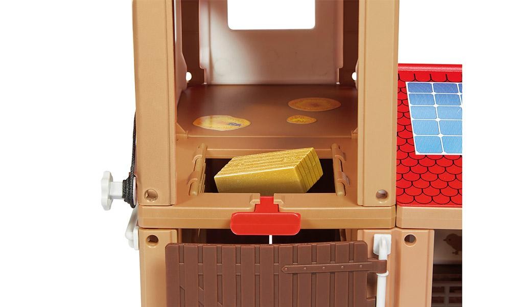 Il se passe toujours quelque chose dans une ferme et il y a toujours quelque chose à faire. Les balles de foin sont soulevées dans la grange à foin à l'aide de la grue. Le John Deere Gator avec des barattes de lait se trouve devant le bâtiment; les barattes doivent être amenées au point de collecte du lait. Deux vaches regardent curieusement hors de l'étable et attendent que les auges soient remplies La ferme est le complément idéal à l'écurie pour chevaux siku