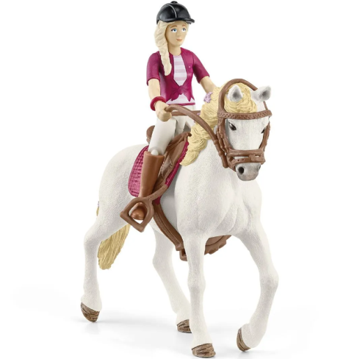 HORSE CLUB Sofia & Blossom de schleich® HORSE CLUB sont tout simplement inséparables ! Depuis que la jument andalouse a donné une pichenette espiègle à Sofia lors de leur première rencontre, plus rien ne peut séparer les deux amies. La figurine Sofia est entièrement articulée et peut non seulement se tenir debout mais aussi chevaucher et s’asseoir. La selle, la bride et les rênes sont parfaitement adaptées au tempérament de la figurine équestre, et Sofia porte une bombe et un bracelet magenta du HORSE CLUB : le signe de reconnaissance de son club.