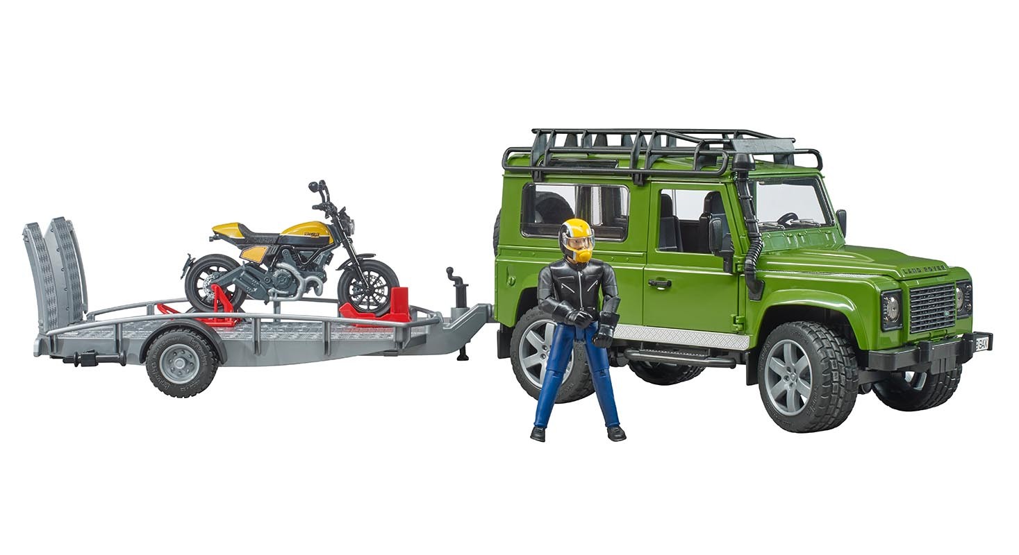 Pack Bruder avec une jeep Land Rover Defender, une moto Ducati Scrambler